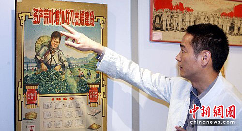 一幅1960年“大跃进”时期以“多产茶叶增加收入支援建设”的年历画,反应当年中国人民“超英赶美”的理想。中新社发 洪少葵 摄
