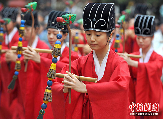图为舞蹈系学生们在表演八佾舞中的文舞。