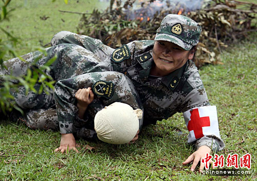 5月11日,位于广西南宁的解放军303医院女兵护士以野战训练比武形式庆祝即将到来的护士节。当天,一群佩戴“红十字”袖章的迷彩队员在浓浓的“战火硝烟”中穿梭往来,前救后送,不到1个小时就快速完成了伤员包扎及野战条件下静脉穿刺等多个演练科目,展示出娴熟的战场自救互救技能。
