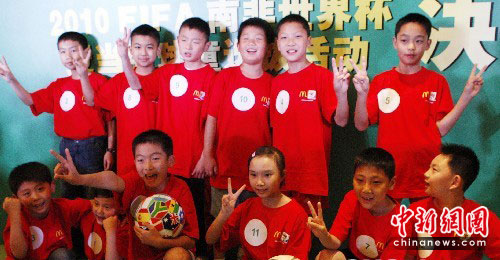 5月12日,“2010南非世界杯球童选拔”活动在北京举行决赛,四名小朋友凭借出色表现获得2010年南非世界杯球童资格,他们将与另外两名来自四川平武县地震灾区的儿童踏上南非之旅,作为球童与参赛球员牵手步入世界杯赛场。