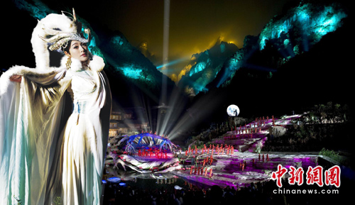 5月14日在深圳举行的文博会上,世界第一台大型山水实景音乐剧《天门狐仙·新刘海砍樵》在全球海选“狐仙”主演和“狐妃”演员,让美丽神奇的天门山下荟萃天下最美的狐仙,获选的演员也将作为张家界旅游形象大使。以世界自然遗产地湖南张家界为背景的世界首台大型山水实景音乐剧《天门狐仙·新刘海砍樵》公演4个月共有15万中外游客观看。气势磅礴的宏大场面、强烈震撼的视觉冲击、美轮美奂的舞蹈音乐让观众如痴如醉。中新社发 肖前辉 摄