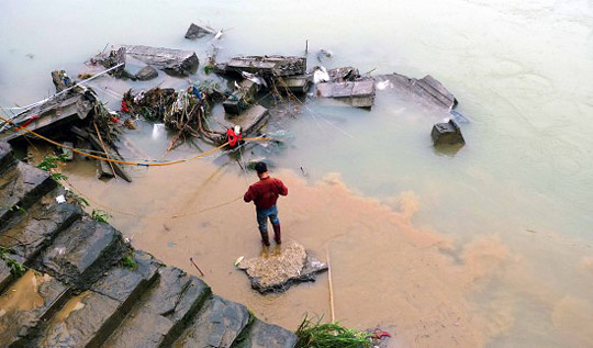 5月15日,一位居民在断桥的残垣旁清理杂物。赵众志 摄