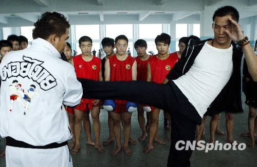 图为泰拳王参观少林寺武校并示范动作。中新社发 钱兴强 摄