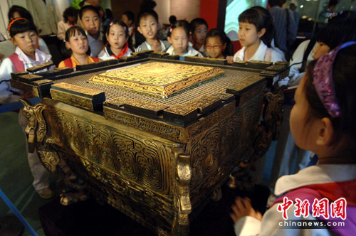 5月18日,2010年北京5·18国际博物馆日启动仪式在首都博物馆举行。当日,首都博物馆2001——2010年征集、捐赠文物展开幕。图为北京学童在展厅观看“第29届奥林匹克运动会组委会组织委员会捐赠文物--缶”。中新社发 邹宪 摄