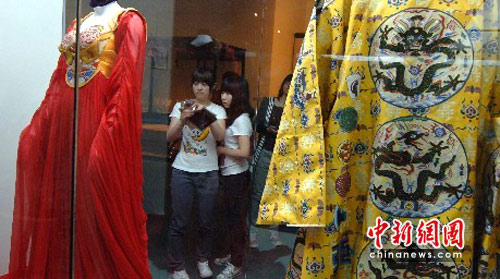图为来宾参观“明万历十二章衮服”仿品和“鸾凤双栖牡丹华服”。中新社发 邹宪 摄