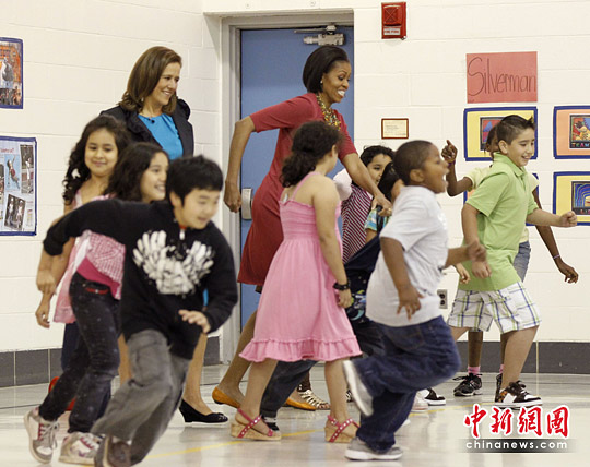 5月19日,美国第一夫人米歇尔和到访的墨西哥第一夫人萨瓦拉来到马里兰州Silver Spring的一所小学访问。在访问期间,米歇尔和萨瓦拉童心未泯与小学生一起赛跑玩游戏。