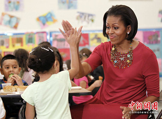 图为美国第一夫人米歇尔与小学生击掌庆祝胜利。