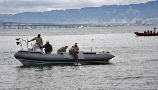 一只隶属于美国海军的海豚特种兵跳上快艇
