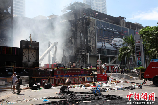 泰国军队武力驱除红衫军示威者的行动已过两天,19日下午被人放火的曼谷世贸中心垮塌部分仍疑有余火。