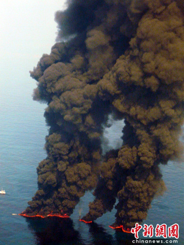 图为墨西哥湾“深水地平线”钻井平台泄漏在海上的原油正在燃烧。