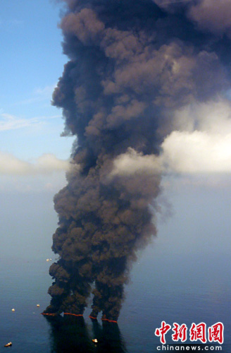 图为墨西哥湾“深水地平线”钻井平台泄漏在海上的原油正在燃烧。