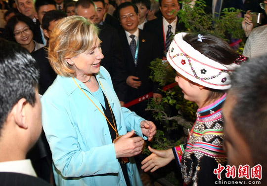 5月22日,美国国务卿希拉里·克林顿参观上海世博会中国馆,与云南馆少数民族演员交流。