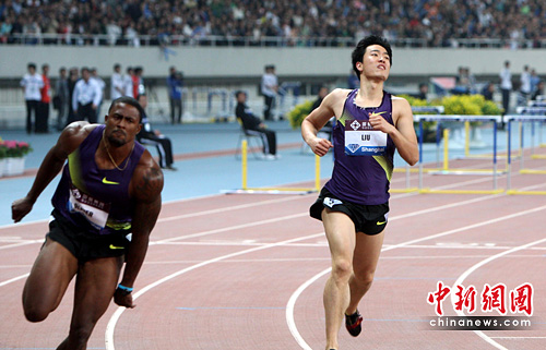 中国选手刘翔在男子110米栏的比赛中,以13秒40夺得铜牌。中新社发 汤彦俊 摄
