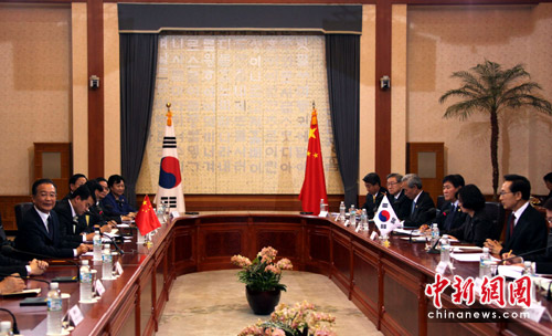 5月28日,正在韩国访问的中国总理温家宝与韩国总统李明博举行会谈。