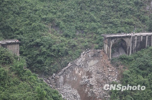 319国道重庆彭水段红泥槽桥26日晚发生垮塌,正在桥上行驶的一辆工程车坠落桥下坡地,司机受伤。垮塌使319国道重庆主城区至彭水苗族土家族自治县交通部分中断。记者了解到,事故原因正在调查中,而这座桥1998年才建成投入使用。图为大桥垮塌现场。中新社发 郭虹 摄