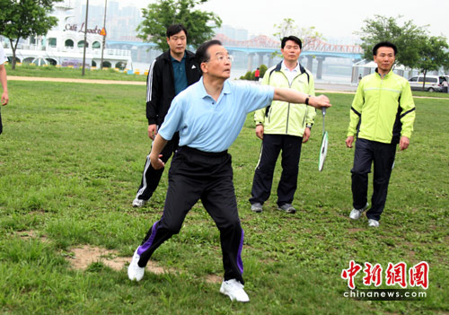 5月29日清晨,正在韩国访问的中国总理温家宝来到首尔汉江市民公园晨练,与正在这里锻炼的首尔市民“拉家常”。图为温家宝与一位首尔市民打羽毛球。 中新社发 周兆军 摄
