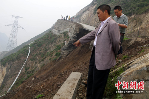 图为汶川县县长张通荣在塌方道路处查看灾情。中新社发 施龙斌 摄
