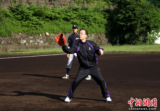 5月31日早晨,正在日本访问的中国总理温家宝来到东京上智大学,与该校大学生一起打棒球。中新社发 周兆军 摄