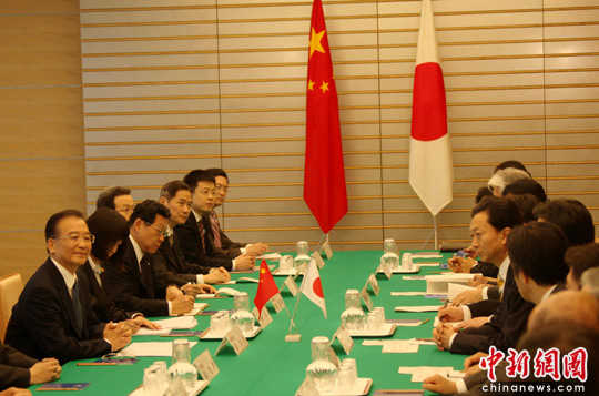 5月31日,中国总理温家宝在东京与日本首相鸠山由纪夫举行会谈。双方同意,重建两国总理热线,正式启动落实东海问题原则共识的政府间换文谈判。中新社发 周兆军 摄