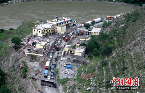 图为国道213线公路上大量车辆通行受阻。 中新社记者 刘忠俊摄