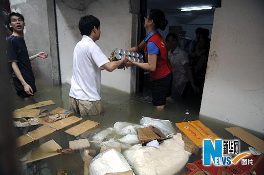 6月1日,广西东兰县城一家超市的员工搬运被洪水浸泡的货物。5月31日23时至6月1日凌晨,广西东兰县遭受暴雨袭击,全县降雨量大于50毫米,其中兰木乡降雨量达到100毫米以上。暴雨造成山体滑坡、道路塌方、店铺和民房被浸泡。目前,当地政府正在积极组织群众抗洪救灾。韦礼富 摄