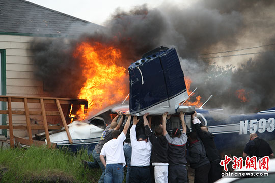 图为人们在救援起火的飞机。