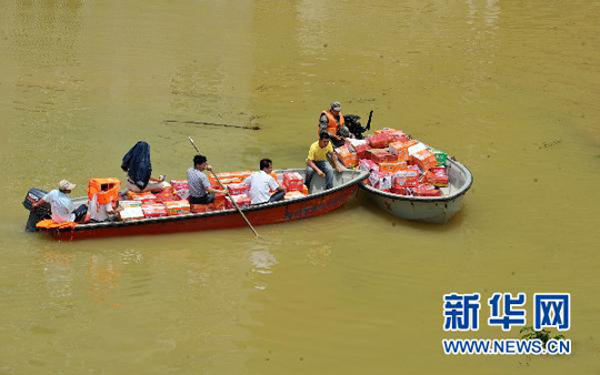 6月3日,在广西忻城县北更乡街道,运送救灾物资的船只在洪水中等待靠岸。广西壮族自治区民政厅当日下午发布消息称,截至6月3日16时,广西已有9市40县(市、区)受灾,受灾人口超过282万人,累计紧急转移安置14万多人。