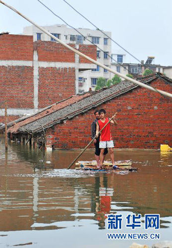 6月3日,在广西来宾市兴宾区镇东社区,严重内涝仍未消除,当地居民乘自制交通工具出行。周华 摄