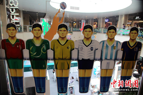 图为一商场近日将各国球员的形象贴在围栏上。中新社发 苏丹 摄