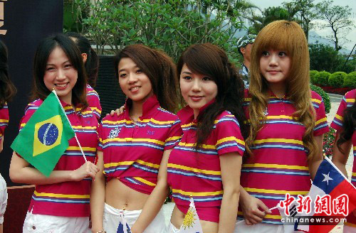6月5日,来自台湾、福建等两岸各地的“足球宝贝世界杯”启动仪式在福州举行,两岸足球宝贝手里拿着自己喜观的各国国家队国旗,为其加油。中新社发 张丽君 摄