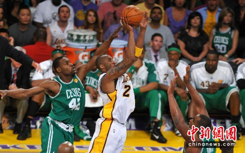 当地时间6月6日晚,2009-2010赛季总决赛第二场比赛在洛杉矶举行。“绿衫军”波士顿凯尔特人队在客场以103比94战胜洛杉矶湖人队,总比分扳成1比1。中新社发 张炜 摄