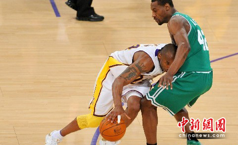 当地时间6月6日晚,2009-2010赛季总决赛第二场比赛在洛杉矶举行。“绿衫军”波士顿凯尔特人队在客场以103比94战胜洛杉矶湖人队,总比分扳成1比1。中新社发 张炜 摄