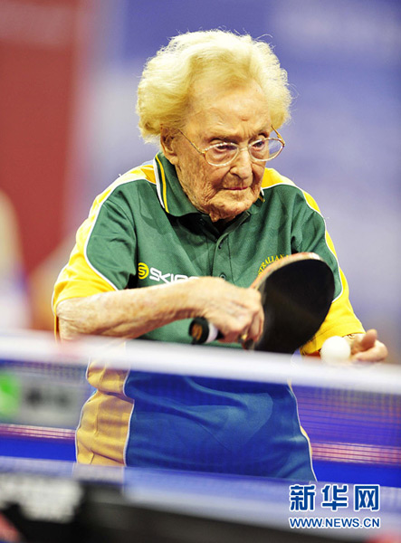 6月7日,100岁高龄的澳大利亚女选手迪罗·多萝西在比赛中。当日,第十五届世界元老乒乓球锦标赛在内蒙古呼和浩特开赛,共有来自51个国家和地区的2076名运动员参加。刘勇贞 摄