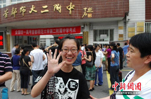 6月8日下午,2010年全国高考北京地区结束最后一科的考试,首都师范大学第二附属中学考点的考生神情轻松地走出考场。中新社发 侯宇 摄