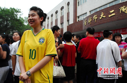 6月8日下午,2010年中国高考北京地区结束考试。一名身着巴西足球队球衣的女同学神情轻松地走出考场,喜迎即将开赛的南非世界杯。中新社发 侯宇 摄