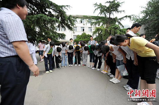 6月9日上午11点,山东高考结束,在山东省实验中学考点,走出考场的考生集体鞠躬谢师恩,并将老师高高抬起,共同庆祝高考结束。