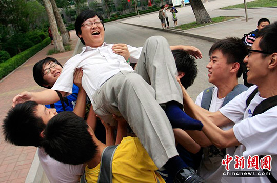 6月9日,在济南一中考点,结束考试的考生将自己的老师高高抛起以谢师恩。崔健/CFP