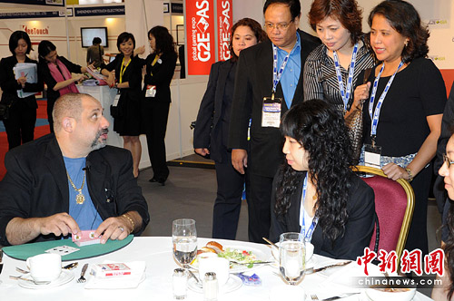 图为防千术著名专家Sal Placente,大玩假洗牌、记牌、做牌及经典的换牌手法等,令在场众目瞪口呆。中新社发 郑祚声 摄