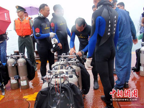 10日上午,中新社记者登上在“南澳Ⅰ号”的打捞船“南天顺”号对打捞情况进行采访。图为打捞队队员在入水前进行设备检查。 中新社记者 陈妍 摄
