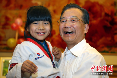 6月11日下午,中国国务院总理温家宝邀请参加“中韩青少年友好交流团”的中韩青少年到北京中南海作客。温总理与来自韩国保育院的20名儿童,来自中国四川、青海地震灾区的19名儿童度过了一个愉快的下午。图为温总理亲切地抱起韩国上绿保育院的女童金秀彬合影。中新社发 任晨鸣 摄