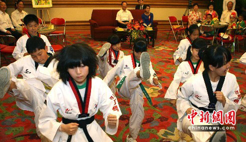 6月11日下午,中国国务院总理温家宝邀请参加“中韩青少年友好交流团”的中韩青少年到北京中南海作客。图为来自韩国上绿保育院的儿童表演根据跆拳道改编的舞蹈。中新社发 任晨鸣 摄
