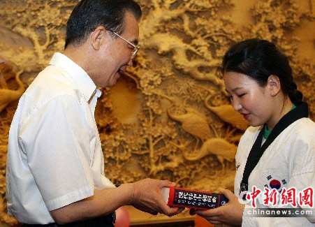 6月11日下午,中国国务院总理温家宝邀请参加“中韩青少年友好交流团”的中韩青少年到北京中南海作客。图为温总理向来自韩国上绿保育院的女童赠送《现代韩中中韩词典》。中新社发 任晨鸣 摄