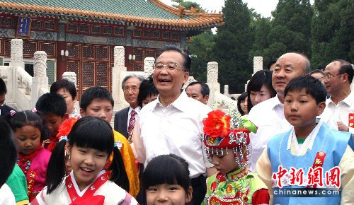 6月11日下午,中国国务院总理温家宝邀请参加“中韩青少年友好交流团”的中韩青少年到北京中南海作客。中新社发 任晨鸣 摄