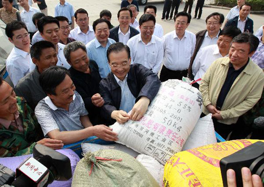 6月10日,在许昌新兴国家粮食储备库门前,温家宝向前来卖粮的灵井乡刘庄村的村民们了解小麦产量、价格以及收购情况。庞兴雷摄