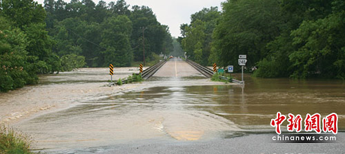 6月11日,美国阿肯色州一处河水水位与桥梁齐平。