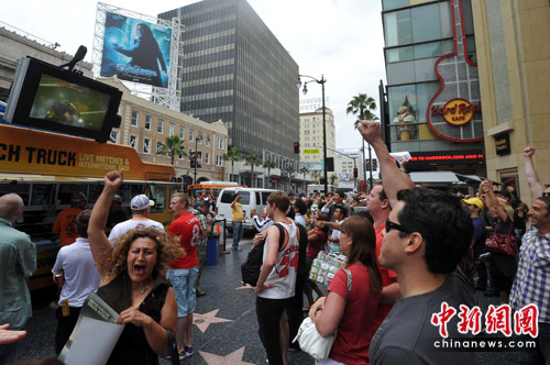 当地时间6月12日中午,来自不同国家的球迷聚集在好莱坞星光大道上,观看世界杯美国队与英格兰队的比赛。当英格兰守门员严重失误丢球后,现场美国球迷一片欢腾。中新社发 张炜 摄