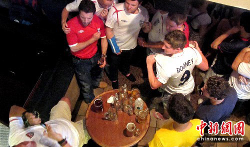 12日下午2时许,在纽约时报广场边上的“ESPN俱乐部”,球迷们早已占据了这座四层楼的体育主体酒吧,里面的球迷有的身披英格兰战袍,有的穿着美国队球衣,各自占据地盘,等待即将开始美英之战。中新社发 孙宇挺 摄