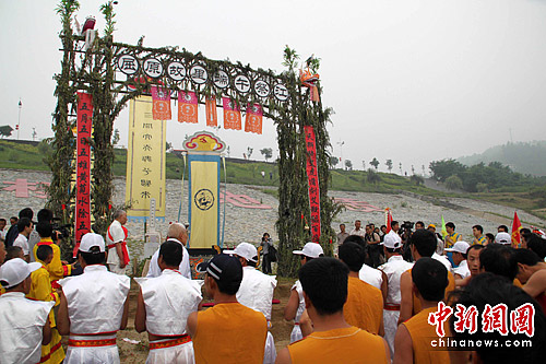 端午节将至,屈原故里秭归县为了再现过去端午祭江的历史,在茅坪镇徐家冲港湾龙舟竞渡起点岸边搭架子,绑艾蒿、菖蒲,粘贴横幅、对联和端阳符,悬挂招魂幡。拜屈原灵位、祭祀龙头、祭祀采用全猪全羊,保佑风调雨顺。