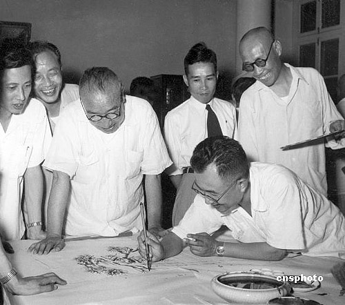 中国著名画家启功在酒会后作画送给国际朋友。后立者为(左起)漫画家华君武、漫画家米谷、画家汪慎生、画家沈柔坚、画家陈潒督。中新社发 张平 摄