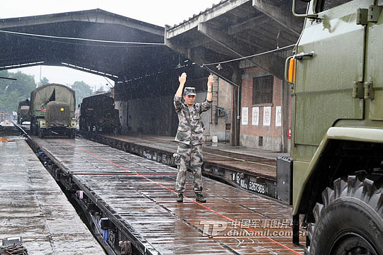 广空高炮某团在暴雨中进行装备铁路装载。